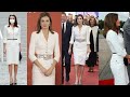During a State visit in 2018, Queen Letizia looked stunning in a white tweed dress. The fitted dress features a notched collar, silver snap button bodice, and patch pockets at the front. It is the second time she wore this suit dress. Now you can recreate her elegant look with our affordable version, which includes a skinny black belt and a slit at the back center.